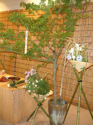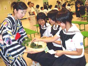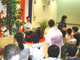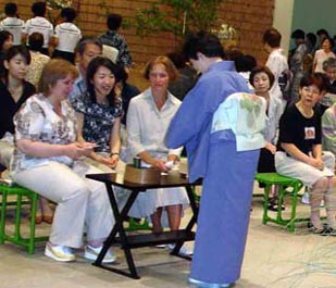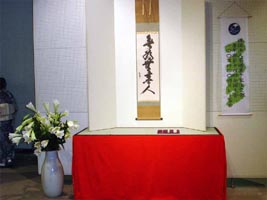 | 前日に筑豊入りしたお軸とお茶杓は、松隈副支部長邸を出発し、迫田ブロック長と清藤副ブロック長の手により、私たち青年部のもとへリレーされて参りました。 当日は祇園祭の日で、飯塚の街も祭一色に染まり、勇ましい若衆の声があちこちで響いていました。そんな中、今年も恒例となった祇園茶会を、親支部・青年部・学校茶道合同で執り行い、その席にリレーされたお道具を展示させていただきました。例年地域の方で賑わう茶会も、今年は思わぬお道具の登場に、嘉穂高校の生徒さんをはじめ、海外のお客様も熱心に説明を聞いて下さり、展示コーナーは常に人集りでした。 お茶を通じての交流で日本の文化を発信し、微力ながら地域発展のお役に立てるということは、何より幸せなことです。この幸せのバトンを次に送り、これからも親支部・学校茶道と共に、がっちりとスクラムを組み、“筑豊は一つ”を合い言葉に精進していきたいと思います。いつも青年部を温かく見守って下さる皆様に心から感謝申し上げます。 |