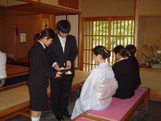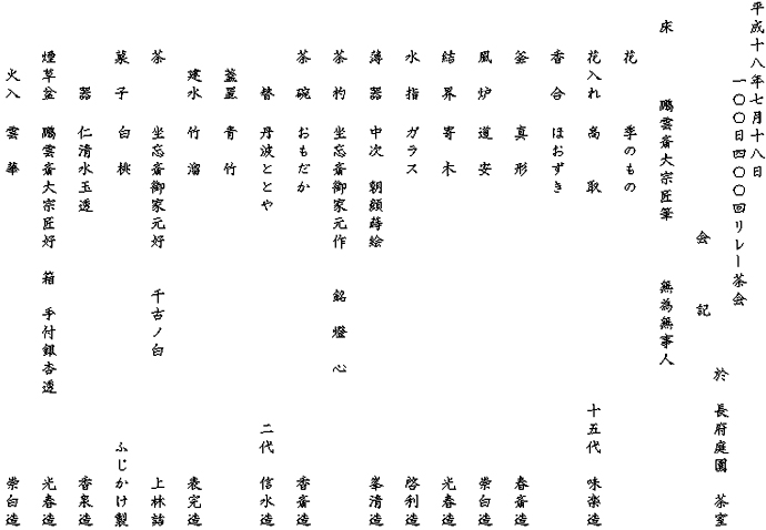 | 前日に引き続き長府庭園にて、お客様に大宗匠・お家元のお道具とお茶を楽しんで頂きました。朝から生憎の雨模様でしたが、青年部会員の熱い思いに押されてしまったのか、早々に雨雲もどこかへ消えてしまい、お天気は何とか持ち応えてくれたようです。 平日ということもあり、お客様にゆっくりとお茶を召し上がって頂くことができたように思います。また、夏らしいお道具の取り合わせも喜んで頂けました。 東亜大学の学生の皆さんには、受付や水屋・お運びのお手伝いをして頂き、2時過ぎには、維新青年部へと無事にお道具をお渡しすることができました。 2日間にわたり、開催させて頂いたリレ−茶会ですが、多くのお客様にお茶を楽しんで頂くことができました。暑い中、ご協力を頂いた先生方や大学生の皆さんには、心より感謝申し上げます。 |