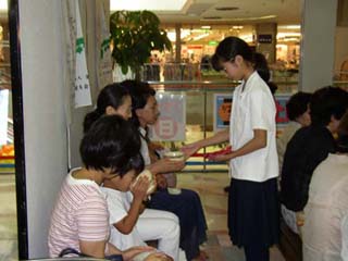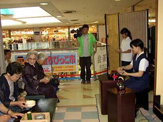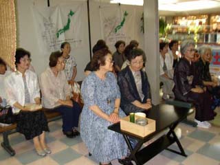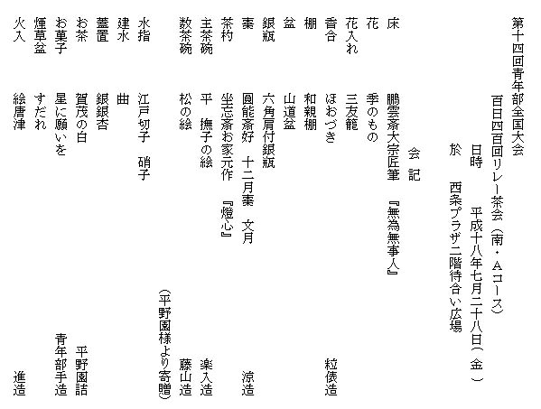 | 東広島市の中心、西条駅からほど近いショッピングセンター、西条プラザの2階にあります待合い広場に於いて、席を設けさせて頂きました。お菓子の銘を『星に願いを』とすることで、全国大会の『祈り』というテーマを皆さんに知って頂けたらと思い、星形のお菓子を手造り致しました。 広島県立中学・高校の茶道部の生徒さん6名もご参加くださり、お点前、お運びを担当してくださいました。学茶の生徒さんと合同で茶会をするのは、初めてのことでしたが、てきぱきと行動する皆さんと一緒にすることができ、青年部参加者も大変すばらしいひとときを過ごすことができました。 また、設えなどにつきましては、親先生方には、開場前からお越し頂き、精神面でも多大なご協力をいただきました。全員感謝の気持ちで茶会に臨むことができ、無事に茶会を行うことができました。 引き継ぎ式には、井手ブロック長がお越しになり、山田宗好幹事長先生、高橋宗静副幹事長先生、青年部相談役の折羽宗津先生、前田宗幸先生がお越しくださり、無事にお道具を引き継ぐことができました。 |