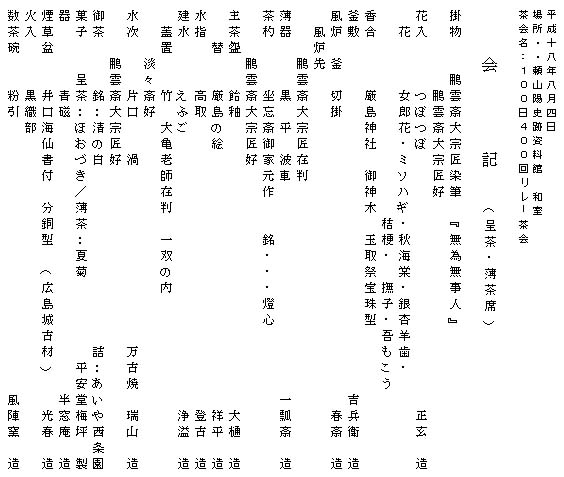 一碗を通して平和を祈られる鵬雲斎大宗匠や坐忘斎お家元のご染筆とお茶杓をリレーしてのお茶会でしたが、原爆犠牲者を多数出した広島での開催は、大変意義のあるものではないかと思いました。