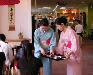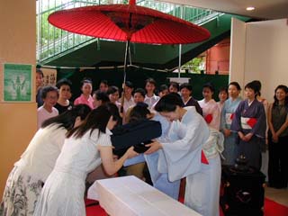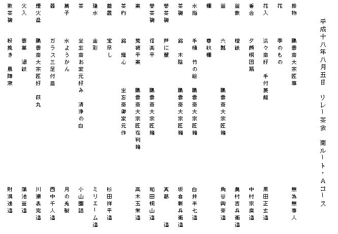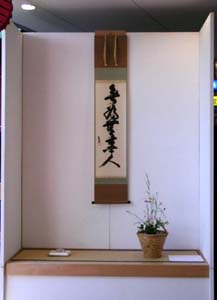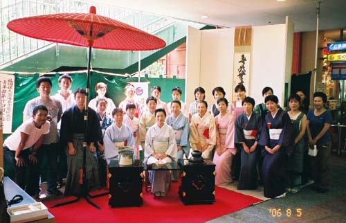| 8月5日、JR横川駅前大手スーパー フレスタさんの店頭のスペースをお借りして、折鶴青年部担当のリレー茶会を開催した。 育成委員会とフレスタさんの協賛を頂き、茶道愛好家、一般市民の皆様に沢山お越し頂く事が出来た。 お水屋を担当して頂いた育成委員会の先生方がタオルを首に巻いて茶筅を振ってくださり、頭の下がる思いだった。 青年部の会員の中には、職場の老人ホームのお年寄りをお誘いして来てくれた者、留学生と一緒に折鶴コーナーを担当してくれた者、親子・家族で一緒に参加してくれた者等が有り、様々な形でこのお茶会に関わってくれた事で、全国大会への意欲を高揚させることができた。 今回のリレー茶会を通し、私達は鵬雲斎大宗匠御染筆「無為無事人」、御家元御自作「燈心」のお心を頂戴し、今日の出逢いを大切に、今このひと時を大切に、これからも一碗からピースフルネスの精神で青年部一丸となって精進していく決意を新たにした。 |