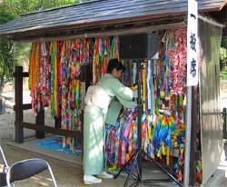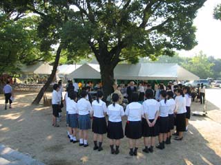 その後は参拝に訪れた一般市民の方々約600名余りにお茶とお菓子を差し上げました。この行事は毎年学校茶道の生徒さんにも参加していただいてますが、今回も広島第二支部学校茶道連絡協議会の大学・高校・中学校9校約47人の学生がお運びを担当し市民の方々の好評を得ました。