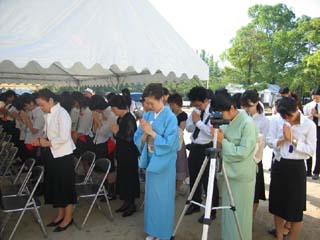 毎年続けている行事ですが、この度は大宗匠・御家元のご染筆、お茶杓を使わせていただくことで大きな力に見守られているようでした。又「祈り」と言うテーマを与えられてより一層はっきりとした平和を祈念する思いで奉仕させていただきました。広島で生まれ、育った私たちは茶道を心の燈火として戦争のない無事な世界が1日も早く訪れるよう祈りながら活動していきたいと思います。