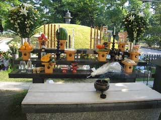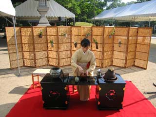 早朝より夏の暑い日ざしが照りつける中、多くの犠牲者に花を手向けるため参加者の方々に花寄屏風に献花していただき、その後一服のお茶を原爆死没者供養塔に捧げました。又、今回は中部中国ブロック内のリレー茶会で折られた折鶴も併せて捧げ、8時15分には参加者全員で黙祷いたしました。