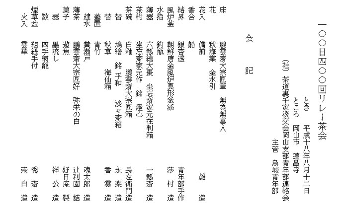 | 主管の烏城青年部会員は、リレー茶会に初めて参加の方が多く、緊張の中にも数々の勉強すべき点があったこと、個々の反省が感謝の念に変わったことなど、収穫の多い茶会となりました。 最後になりましたが、幹事長先生始め役員の先生、推薦先生には大勢の参加を募っていただき、ご協力賜りましたこと御礼申し上げます。 |