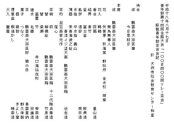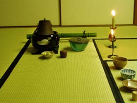 | 大洲市社会教育センター和室にて茶会を行いました。顧問の中川様、幹事長先生をはじめ、60人の方が来席してくださいました。 茶会の趣向は‘つなぐ’。チャリティー展に出品した燭台の紹介も兼ねて蝋燭を灯し、その穏やかな炎の下で、青年部から青年部へと受け渡されるお道具、席に集ってくださったお心、過去より伝わり未来へと伝えられるもの・・・・など、さまざまなつなぎつながれているものを想い、青年部会員8人お手伝い2人で心を込めておもてなしいたしました。 平日の開催ですので、ささやかな会にと思っていたこのリレー茶会ですが、相談役の先生はじめ多くの先生方にご指導ご協力いただき、思いがけない大きな会になりました。 茶会を支えてくださった多くの方に感謝をしつつ、無事、全国大会へ‘つながる’茶会の一端を担い、いずしね青年部へとバトンを‘つなぎ’ました。 |