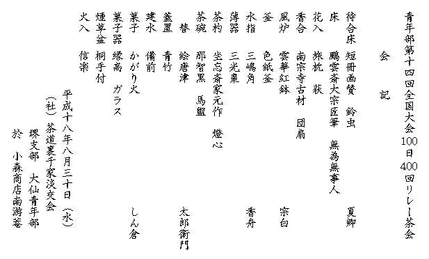 堺支部は和泉・大仙青年部が合同で、Aルート・Bルートのお道具を以って其々の席を持たせていただくことになりました。まだまだ暑い夏の午後ではありましたが、南宗寺田島碩應老師、吉川幹事長先生はじめ諸先生方・大学茶道部の学生・また夕方からは仕事を終えた青年部会員・多くのみなさまにおいでいただきました。南游菴三畳台目の小間でお客様をお迎えしましたので、亭主とお客様、またリレーのお道具とお客様との距離がとても近く、心をこめて一服を差し上げることができたのではないかと思います。最後に大阪南支部永和青年部に無事引き継ぎをさせていただきました。 全国大会まであと一ヶ月、全国のお仲間の思いとともに京都に辿り着いたお道具との再会を祈りつつ… |