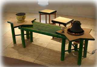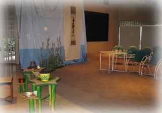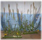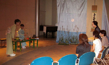 | 残暑厳しい中、少しでも秋の気配を感じていただこうと、ススキや草花を生け、満月と流れ星をスクリーンに映し、秋の夜の趣向で皆様をお迎えし、永和青年部のリレー茶会を行ないました。 青年部手作りの星をかたどった竹の立礼棚を、大会テーマの「祈り」にちなみ「流星」と名付け、流れる星に、平和とリレー茶会が無事終えられることを祈りながらお席をつとめさせていただきました。 九州・中国・山陰・四国そして近畿へとリレーされて来たお軸とお茶杓に、各青年部皆様の思いが込められているように感じ、例えようのない責任感のようなものを感じました。そして無事、東支部青年部へ引継ぎを終え、ホッといたしました。 平日にもかかわらず、お越しいただきました親先生方、OBの皆様には感謝いたしますと共に、皆様と青年部員で全国大会の一端をつとめられた喜びを感じ、無事、お軸とお茶杓が全国大会までリレーされて行くよう祈りました。 |