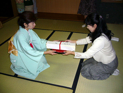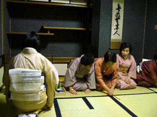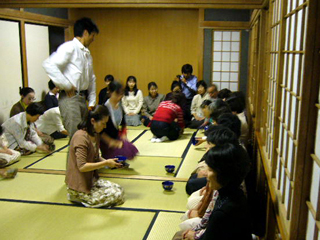 | 平日の夜に開催しました、リレー茶会でしたが、分会先生方をはじめ一般の方に多数参加していただきました。青年部一同普段接することのない、大切なお道具を扱わせていただき、緊張と感激のお茶会となりました。薄茶席、及び点心席をいたしましたが、季節柄、点心にはおはぎを出させていただきました。好評のうちに無事終了し、一同感慨深くお道具を南信支部へリレーさせいただきました。またとない経験をさせていただき、深く感謝しております。ありがとうございました。 |