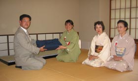 | 台風が近づき、真夏かと間違う気温の中、リレー茶会が始まりました。 全国大会の懇親会や敬老の祝いの思いを込めて、テーマを「宴」としました。 「宴」で使われる楽器や杯などで、道具組みをしました。 お水は近くの山から湧き出る「延命清水」を使い、皆が健康で長寿であるよう願いました。 また、近くの小学生の茶道クラブの生徒さんがお手伝いの来てくださり、お菓子やお茶のお運びをしていただきました。 3時過ぎ、お軸とお茶杓をうおづ青年部へ無事の引き継ぐ事ができ、会員一同ホットしました。 小人数の青年部ですが、皆が可能な限り協力しあい茶会を行う事ができました。この皆の思いを全国大会へ持っていこうと思います。 最後に、会場が著作権の関係で写真撮影の制限があった為に、写真の枚数が少なくなってしまいました。 |