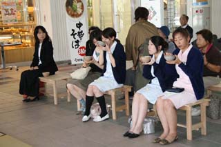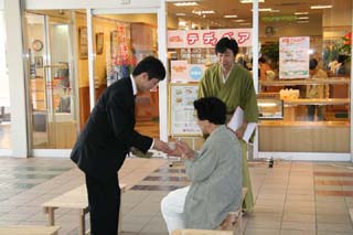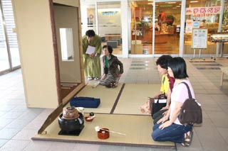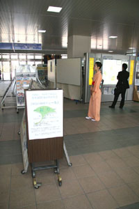 駅を利用される一般のお客様が次から次と訪れ、予想を大幅に上回る400名近いお客様をおもてなしすることができました。思いもかけずお茶を振舞われたお客様は、興味深くお軸などのお道具やリレー茶会、全国大会についていろいろ質問されました。予期せぬ質問も飛び出し、多少とまどいながらもなんとか受け答えすることができました。