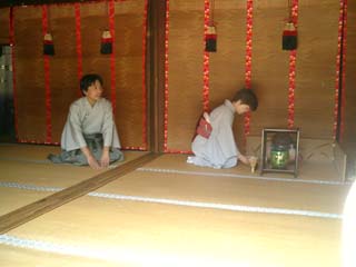| 世界遺産である下鴨神社の中にある神服殿をお借りして、裏千家学生茶道研究会の学生さんたちにお手伝いいただきリレー茶会を行いました。神服殿は葵祭の際に斉王代がご着座される場所であり、普段は中に入ることはできない場所です。その貴重な場所でのお茶会ということで亭主側もお客様も緊張した中のお席でしたが、青年部のメンバーと学生さんたちがお互いに助け合いすばらしいお席にすることができたと考えております。お越しいただいたお客様も喜んでいただけたと確信しております。お天気も良かったこともあり、下鴨神社の長く続く歴史とともに、リレーで回ってきた皆さんの想いを重く受け止め有意義で楽しい時間を過ごすことができました。 |