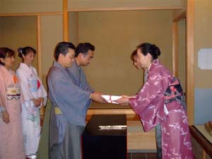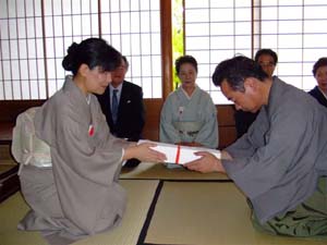 | 9時15分 | 熊本六青年部合同リレー茶会出発式 来賓挨拶(島田副支部長・江崎幹事長)終了後、迫田九州ブロック長(青年部)より、お道具(軸・茶杓)の引継ぎを受ける。 |