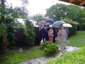 | 時折激しい雨の降るあいにくの天気となりましたが、島田副支部長、江崎幹事長、迫田九州ブロック長、支部幹事の先生方のご臨席を賜り出発式が行われました。6月23日は太平洋戦争沖縄戦の終了の日で、まさしく、その日に沖縄から出発したお軸と茶杓の引継ぎを受け、今回の全国大会の「祈り」(一碗から平和を)を改めて心に刻むことが出来ました。 お茶会は、雨の中を300名以上のお客様にお越し頂き無事に終了することが出来ました。1席30名の予定でしたが、早くからお集まり頂いたお客様にできるだけ早めに席入りしていただく為、予定の1席30名を超えるお席が続き、多少窮屈な思いをされたのではと思いましたが、笑顔で席を後にされるお客様をお見送りして一安心した次第です。 茶会終了後、お道具を、あまくさ青年部に引継ぎました。 |