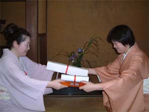 | 大島邸にて15:00より迫田ブロック長・清藤副ブロック長・久原幹事長はじめ、沖縄支部おもろ青年部の方々や親先生達が来てくださり無事にリレー茶会を終えることが出来ました。 七夕の時期ということで、お菓子を天の川に見立てて「星の光」にしました。香合は、大宗匠が家元時代にタイに行かれた折お箱書きを下さった「マンゴスチン」を使わせて頂きました。 皆様が見守る中、他青年部・唐津青年部の想いを乗せたお道具を大分支部こくぶ青年部に無事引き継ぐことが出来、安心致しました。 |