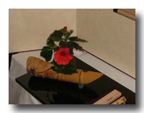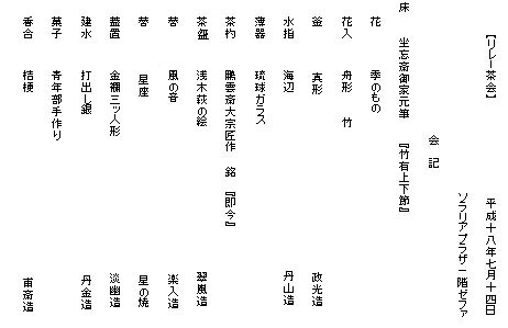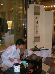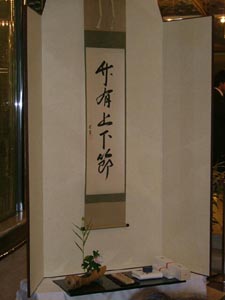 | <感想> この度の茶会では、お床を会場に準備してお家元のお軸と大宗匠のお茶杓をお披露目させていただきました。週末で飾り山笠を観覧に訪れる沢山の人で賑やかな中、そのお床には静寂が感じられ、お床に目を取られ、席入りされるお客様が沢山いらっしゃいました。お軸を眺めお言葉を考えながらお茶をいただき、しばしせわしい日々から離れられたのではないかと思います。お茶に興味を持たれ、質問も見受けられました。平日での催しということで準備から大変でありましたが、地域の沢山の方々との一期一会が実施でき、大変貴重な体験をすることができました。ありがとう御座いました。 |
