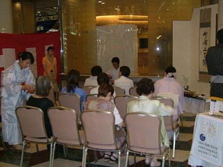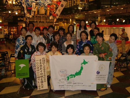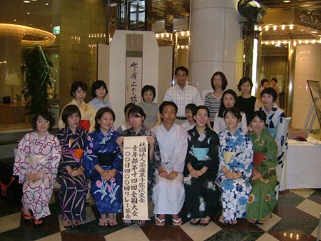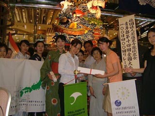 | <実施概要> | ・ | 福岡代表のお祭りであります「山笠」の飾り山笠の前にお席を設けた立礼茶会といたしました。 | ・ | お祭りにちなんで、青年部会員は浴衣を着てのチャリティ茶会としました。 | ・ | 南ルートBコースは沖縄からの出発でしたので、花入れを舟形、お花をハイビスカスとするなど「沖縄」にちなんだとり合わせにしました。 | ・ | 場所が福岡市中心部(天神)ということもあり、沢山の一般市民の方にも席入りいただき、お茶と青年部手作りのお菓子を楽しんでいただきました。 |