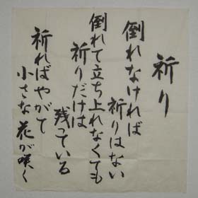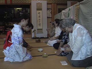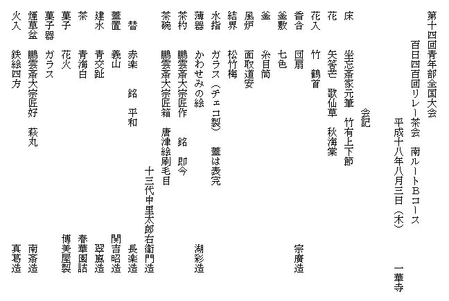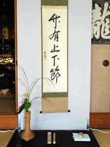 | 呉支部では3日目となるあけぼの青年部でのリレー茶会は、禅宗一華寺にて行いました。 盛夏の夕刻ということで、皆様により涼しく感じていただきたく思い、浴衣でお迎えしました。 茶席の前に、禅堂にて一華寺閑栖香川寛光先生の講話の後、守屋佑光和尚のご指導のもと静坐をさせて頂きました。静かな禅堂の中で、今大会のテーマ〜祈り〜について皆それぞれに心静かな大切な時間を持たせて頂くことができたようです。 また、この度のリレー茶会に寄せて“祈り”という詩を寛光先生より頂戴しました。 その後、本堂にて、坐忘斎御家元の「竹有上下節」を掛け、鵬雲斎大宗匠の「即今」のお茶杓にて、薄茶を差し上げました。 昨日より今日へ、今日から明日へと、いろいろな気持ちもリレーできた一日でした。 |
