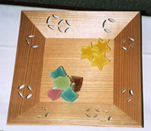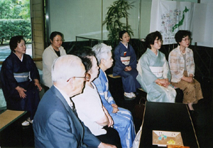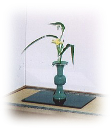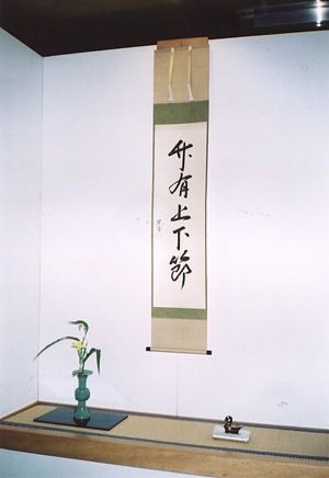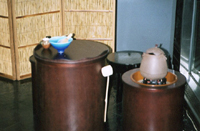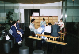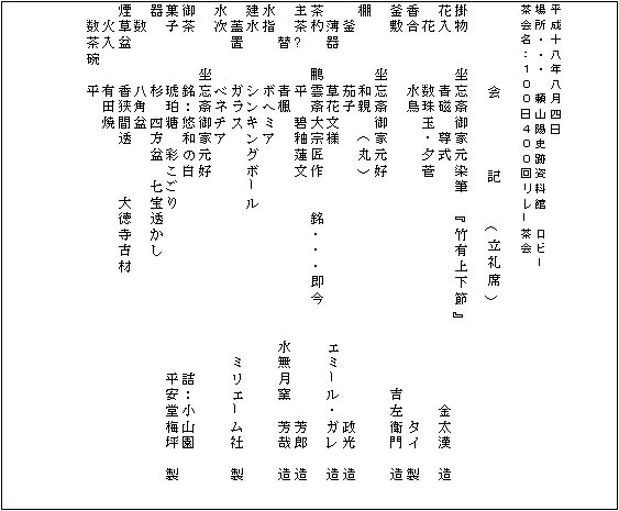 立礼席は、坐忘斎御家元ご染筆のお軸が飾られ、坐忘斎御家元お好みの和親棚を使用して、竹の茂った景色の良い中庭と一体感のあるロビーにて行い、薄茶席とは趣向の違った洋風な道具組みでお茶席を設けました。場所的に狭いかもしれないと思いましたが、床机や和親棚の配置を工夫し、お客様には外の景色とお点前を同時に見ながら広々と座っていただけるようになりました。外の様子が見えるので日が暮れていく様がよくわかり、日が暮れると同時に行灯の灯りがクローズアップされ、お客様には幽玄な感覚を味わっていただけたようでした。また、お道具類はガラスやカラフルな色合いの茶碗等を使わせていただき、お客様には大変喜んでいただきましたが、坐忘斎御家元のお軸や鵬雲斎大宗匠のお茶杓を使わせていただくことで、場が引き締まり、可愛さ、楽しさの中にも深く気持ちのこもったお茶会になったように思います。