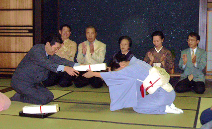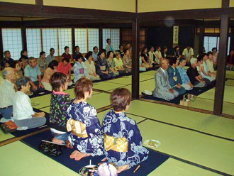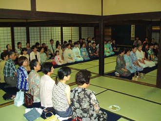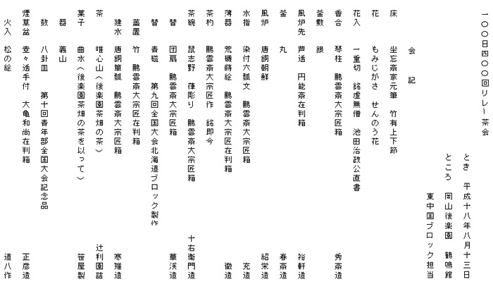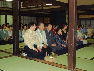 | 東中国ブロック最終日は、岡山後楽園 鶴鳴館において13青年部揃って席を持たせていただきました。Aコースは男性でキリリと、Bコースは女性で優雅にと、同じ建物の中ではありますがメリハリのある席を設え、お客様には共通で二席にお入りいただきました。 ブロック内最終日を見届けていただいた会員の方のみならず、園内で開催されている夏の風物詩ともなった「幻想庭園」に夕涼みに訪れた多くの一般の方にも、一服のお茶を楽しんでいただきました。また、興味を持たれた旅行者の方が熱心に質問されるなど、後楽園ならではの一会となりました。 お盆の入りで手伝いの人数にも気を揉みましたが、たくさんの方のご協力で無事終了することができました。ありがとうございました。 茶席終了後、参事・参事補・幹事長・パスト全国委員の皆様の立会いのもと、四国ブロックへ無事お道具の引渡しをさせていただきました。 各青年部をリレーされてきたお道具に、また新たな祈りを込め、ブロック内青年部の一層強い団結が感じられる有意義な一日となりました。 |