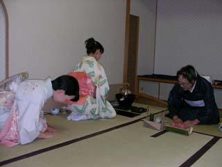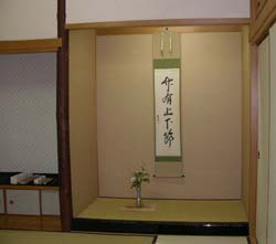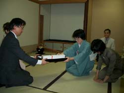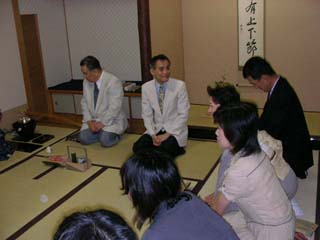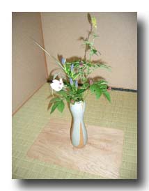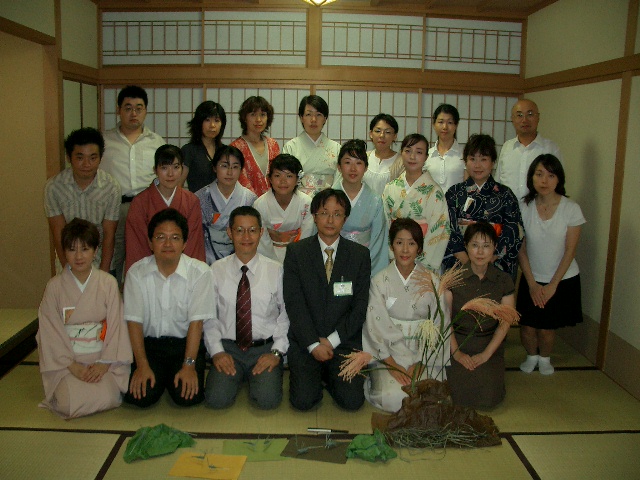 | 前日、大阪北支部天神青年部よりお軸とお茶杓を引き継ぎ、いよいよ我々の番と緊張の中、当日を迎えました。 今回、‘祈り’というテーマを頂き、その気持ちをお客様を迎える心としようと、いかにお席を楽しんでいただくかに心くだきました。たいへん暑い中のしかも夕刻からの茶会ということで、少しの秋を感じて頂きたくて、サブテーマを‘虫尽くし’とし、虫の音とすすきでお迎えし、笹で作った虫を目で楽しんで頂きました。お点前は茶箱で’月’。 点心にはそうめんを青竹の器で用意しました。夏と秋の間のおもはゆさを、青竹と虫で感じていただけたなら幸いです。 水屋で汗を流す会員、会社帰りに急いで集まった会員、また汗だくを顔に出さないようにと着物で迎えた会員、一人一人の思いがひとつになってとてもいいお茶会になったと思います。午後8時半、堺支部和泉青年部に無事引継ぎを終え、リレー茶会を終えました。余談ですが、そのあと青年部会員のみの茶席を設け、ホッとしたひと時を共有することができました。 |