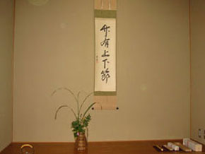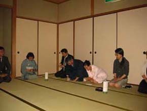 | 参加者 近畿第2ブロック長 小森克也氏 和歌山支部幹事 宮本宗勢先生(学校茶道教授) 紀州青年部会員16名 茶箱の月点前にて、各自持ち寄りの道具にて行いました。 お軸と茶杓を飾った床前をライトアップし、部屋には、竹に和紙を巻き中にろうそくを灯したものを幾つか配置しました。茶会終了後、近畿第2ブロックに引渡しを行い、会費制にて懇親会を行ないました。 平日のため仕事が終わってからの集合となり、南北に長い土地柄、中には1時間ほどかけて駆けつけて下さる会員もありました。 準備はできるだけ簡素にし、ゆったりとひとときを過ごせるように茶箱点前にて、竹のろうそくの明かりのなかで進めました。 幟旗には今年卒業の小林めいこさんに記入していただき、皆一様にリレー茶会のうねりを感じました。 懇親会では全国大会の話に花が咲き、日頃ゆっくり話ができにくい会員と懇親を深めることができたと思います。 |
