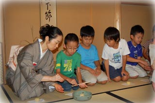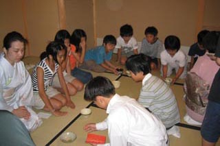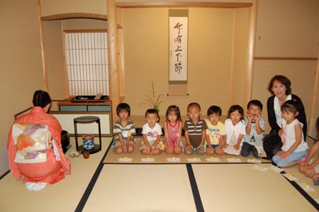 8時40分から15時まで12席が小学生、教職員の方々と預かり保育の子供たちで1席、阪神支部の青年部育成委員会の先生方を中心に1席、計14席させていただきました。1クラスを二組に分け、「お茶に招かれて」のビデオを見てから茶席に入る組と茶席に入ってからビデオをみる組となり、ビデオ室でも質問や感想がいろいろあったようです。子供に慣れていない私たち青年部としては、どういうことになるのか予測もつかず、はじめは不安でしたが、徐々になれてきて、どうすればうまくお菓子を食べてもらえるか、お茶を飲んでもらえるかを伝えることができたと思います。