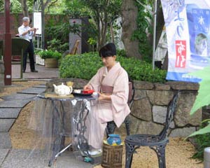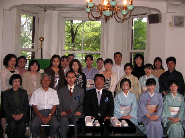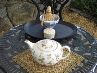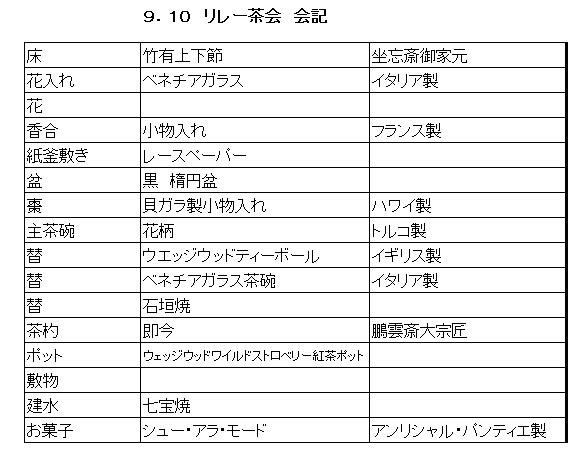 神戸北野の異人館は多くの観光客が訪れる場所で ラインの館はその中で資料館として無料で開放されているところです。この度は庭園をリレー茶会に使わせていただき主に一般の方・観光客を対象とした茶会を開催しました。異人館の建物のすぐ前の庭のスペースにテントを張り ガーデンテーブルで盆略の点前座を設えました。 雰囲気に合わせ 洋風の見立ての道具組みにしました。お菓子もそれにあわせて 地元の有名な洋菓子を使いました。 お客様はベランダのスペースに椅子を並べ気楽に一碗を楽しんでいただけるようにしました。天候が不順で 早朝にはかなり激しい雷雨があり 開催が危ぶまれましたが 徐々に小ぶりになり 茶席を始める頃には雨があがり 晴天となりました。 前日に神戸新聞にリレー茶会の記事をのせていただいたこともあり 近くの方は散歩がてらに楽しみに来ましたと言って下さいました。 親子連れの方は 使っているお道具を見て 身近な物でもお茶が楽しめるのですねと喜んで下さいました。チラシを作成し 道で配ったり 茶券と共に今回のリレー茶会の説明文をお渡ししたりし 蒸し暑いテントでの水屋で汗をかきながらみんなで協力したお席は 大変でしたが 来て頂いた方にとても喜んでいただけたことは参加した者にとっても大変嬉しいことでした。引継ぎ式を始める少し前にまた急に黒い雲が現れ どしゃぶりの雨にみまわれるハプニングもありましたが 近畿第3ブロックのお預りした8日間を無事終了し ブロック相談役の前田様瀬戸口様にお立会いいただき 次の北陸信越ブロックの方に無事引き継ぎできましたことは 大変感慨深く感謝しております