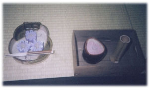 | 4、 | 日本海沿岸文化圏もリレーしますので「渚棚」を用い、主茶碗には時節柄萩の「福俵」を用いました。 |
