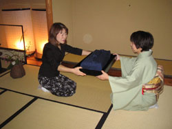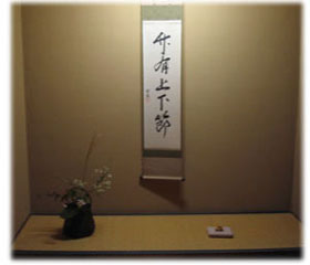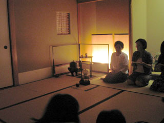 | 小雨の降る中、親先生、先輩方、社中の皆さんをお招きして、リレー茶会を開催しました。今回の茶会のテーマは『みのり』。いろんな想いが実って京都に運ばれますように・・・という想いでお席つくりに努めました。平日の茶会の為、お仕事帰りの皆さまにも来て頂けるようにと開催時刻を夕刻に設定。暗くなり始めたお茶室に行灯を灯し、ゆったりとお茶を楽しんでいただきました。 また、今回は、せっかくリレーしていただいたお家元ご染筆のお軸と大宗匠のお茶杓を、少しでも長く楽しんでいただこうと、二服お茶を用意。話に花が咲くお席あり、じっくりとお道具を拝見されるお席あり・・・と、お客様が思い思いに楽しんでいただけたようでした。 |