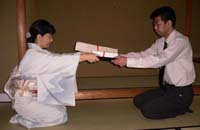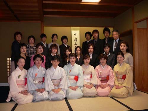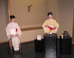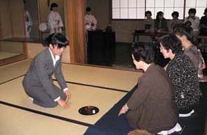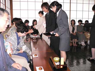 | 金沢城北青年部は、石川支部でのトップバッターとして石川県立能楽堂別館「対青軒」で、北陸大学茶道部の協力を得て、坐忘斎宗匠お好みの和新棚による立礼席を持ちました。 二階第三能舞台を待合いに設え、一階は八畳茶室の床に御染筆を、土間立礼席との区切りをはずして点前座としました。モダンなお棚に、対句「松無古今色」から薄器は松蒔絵大平棗、「四睡図」茶碗、粉引き捻の水指、銀製蓋置、木地曲建水を取り合わせ、吉はし製の主菓子「夜長」と干菓子「小すみ落雁」「名月豆」も好評をいただきました。 当日は、大学生10名と青年部会員22名が仲良くおもてなしして、134名のお客様をお迎えし、多くの人の手によってリレーされてきたお道具を披露することができました。スーツ姿での初々しいお手伝いは、お客様から「見ているだけで気持ちがいいですね。」との声も。 間近となった全国大会も待ち遠しく、また、お家元のお軸「竹有上下節」に、日頃忘れがちな大切なことを改めて思い出させていただき、お茶杓「即今」に込められた大宗匠の願いに添う青年部活動を求めて努力していくことを、心に誓う一日となりました。 |