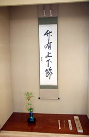 引渡し式には、近畿第一ブロックの中西副ブロック長と大藪全国委員補のお二人がお見えになり、駅のアナウンスが流れる騒々しい中、ことばの唱和から始まった引渡し式は終始、厳粛なムードが漂い、北陸信越ブロックの大樋ブロック長、野崎幹事長からそれぞれのコースのお軸とお茶杓が引き渡されました。