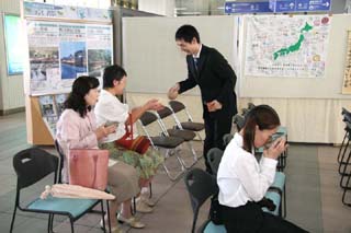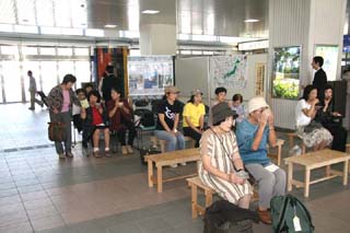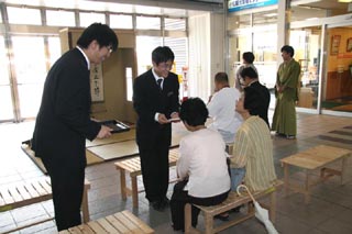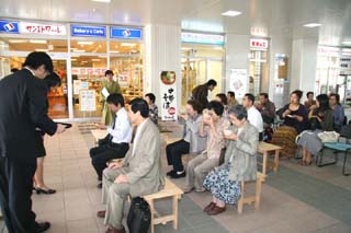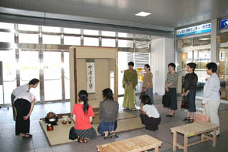 駅を利用される一般のお客様が次から次と訪れ、予想を大幅に上回る400名近いお客様をおもてなしすることができました。思いもかけずお茶を振舞われたお客様は、興味深くお軸などのお道具やリレー茶会、全国大会についていろいろ質問されました。予期せぬ質問も飛び出し、多少とまどいながらもなんとか受け答えすることができました。