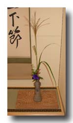 夕方から鳴きはじめるものもあり、夜にはにぎやかと言えるほど虫の音が響く秋の宮津。すだく虫の音に耳を傾けながら、月を愛でる。そのようなイメージで、鈴虫の平棗、主茶碗は萩、替茶碗は武蔵野、大樋焼 兎の絵、蓋置に砧、煙草盆は虫籠、、、と、各人持ち寄りのお道具で、リレー茶会を行いました。