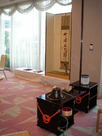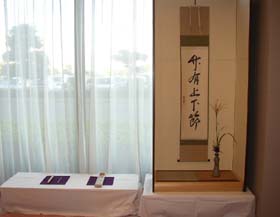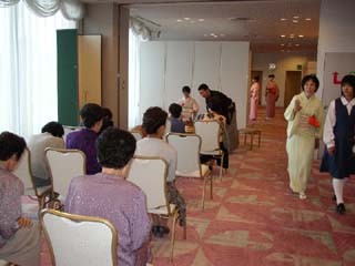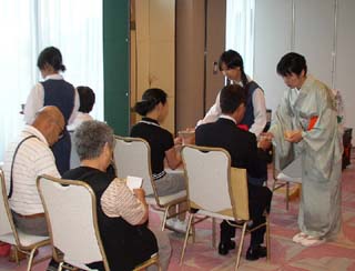 翌9月24日に、宮津支部設立60周年記念大会が、宮津ロイヤルホテルにて行われる関係で、ロビーをお借りしての、立礼席のお茶会となりました。学校茶道との連携が望ましいとのことで、京都暁星高校茶道部の先生、部員の方達にご協力頂きました。場所の制約があったので、お客様には近くのソファーでお待ち頂くことも多かったですが、ホテルの宿泊客の方達もお席に入られ、お喜び頂けました。「これがリレー茶会。」と、どちらからお越しの方かはわかりませんが、リレー茶会の存在をご存知のお客様もおられ、嬉しく思いました。