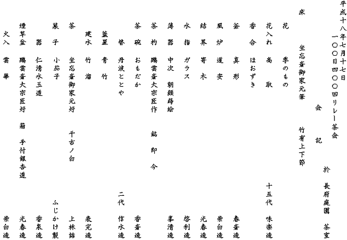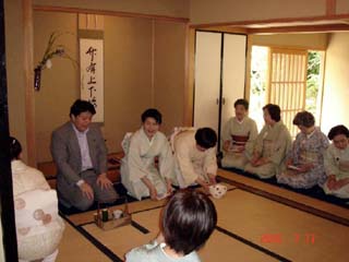| 7月17日は、九州ブロック最終日で西中国ブロックへの引継ぎの日ということで、北九州支部のお席にお招き頂き、お茶をいただいた後、厳粛に引継ぎ式が執り行われました。 無事にお道具の引継ぎを終え、九州ブロックの皆様方の温かいお見送りを受けて、門司港より連絡船に乗って関門海峡を渡り、いよいよ九州から本州へ…。 松田ブロック長、守田わかば西青年部長と共に、波に揺られながら、九州から本州西端の下関へと感動の第一歩を踏み出すことができました。 長府庭園のお席では、林芳正副地区長を始め、多くの先生方の見守る中山尾幹事長先生にお軸とお茶杓を荘って頂きました。 初めにBコ−スのお道具を、そして3席目よりAコ−スのお道具を荘らせて頂きました。また、九州ブロックの皆様方もお越し下さって、お茶を召し上がって頂き、全国大会での再会を約束しました。 当日は大変暑かったのですが、下関市立大学の学生の皆さんにも受付や水屋・お運び等のお手伝いを頂いて、庭園を訪れた観光客の方々や市民の皆さんにお茶を楽しんで頂くことができました。 |