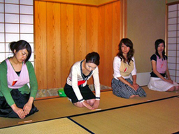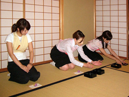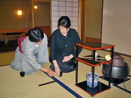 3ヶ月目に入り、盆略点前のあと、柄杓の割稽古など、復習をしながら、御園棚をベースとした薄茶点前が始まりました。 |