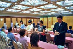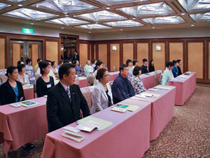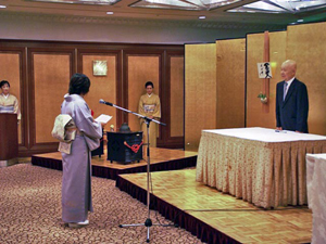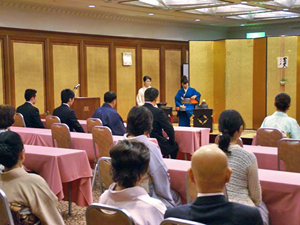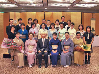 9月19日(水)全22回修了にあたり、リーガロイヤルホテル小倉(北九州市小倉北区)において、許状授与式が盛大に執り行われました。 10月からは、受講生それぞれ、新たに地元の社中でお稽古を続けていきますので、顔を揃えるのも最後でもあり、名残おしく修了しました。北九州支部宮崎宗烏幹事長ほか支部役員20名、また受講生の両親・友人25名が参加。ことばの唱和、宮崎幹事長挨拶後、一人ずつ許状が授与されました。 |