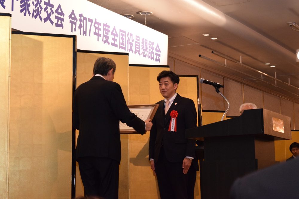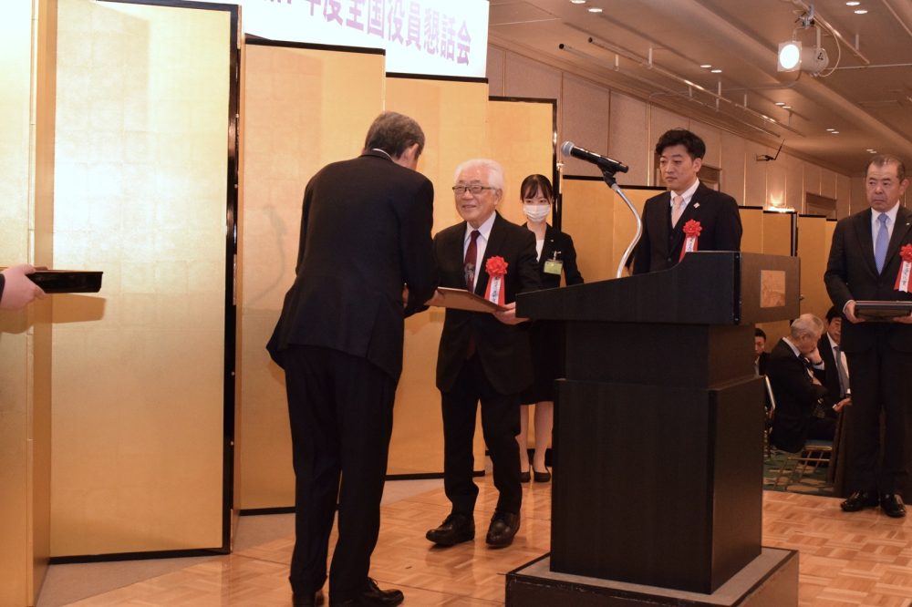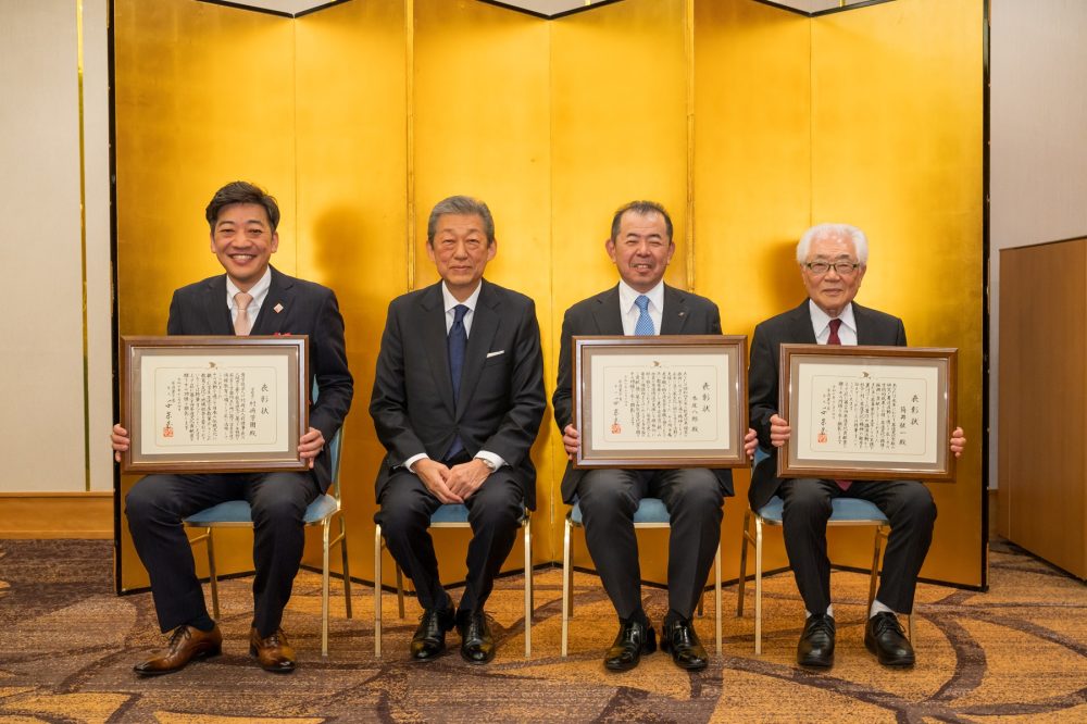 表彰には、本日出席の近畿第二地区副地区長 池田周弘氏(淡交会参事・大阪北支部副支部長)、田所伸浩氏(淡交会特別参事・大阪西支部支部長)、廣田元孝氏(淡交会監事・大阪南支部長)、樫畑直尚氏(淡交会参事・和歌山支部支部長)が登壇、代表して池田副地区長に賞状が手渡されました。
