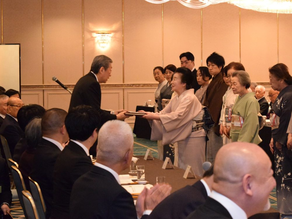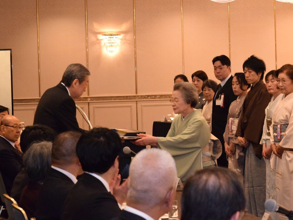 千 宗室会長より表彰楯が授与され、佐藤宗久氏(庄内支部)が代表拝受。伊郷宗恵氏(東京第一西支部)が謝辞を述べました。