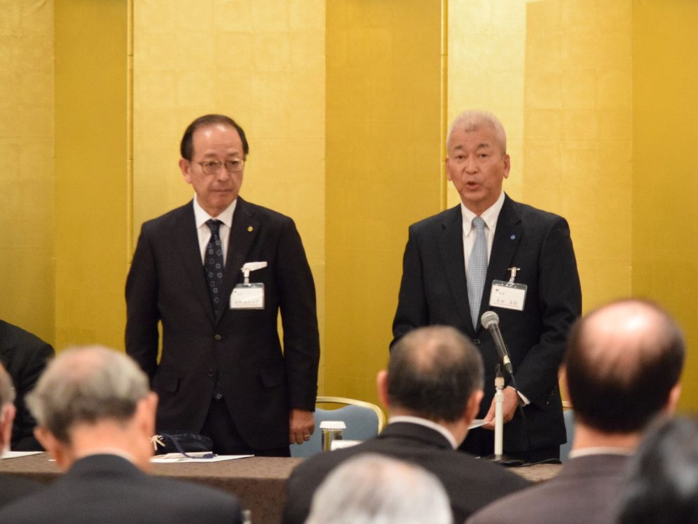 千 宗室会長の挨拶に引き続き、議長に在田吉保氏(参事・高岡支部支部長)・副議長に髙野孫左ヱ門氏(参事・関東第二地区地区長・山梨支部支部長)を選出し、議事が進行されました。