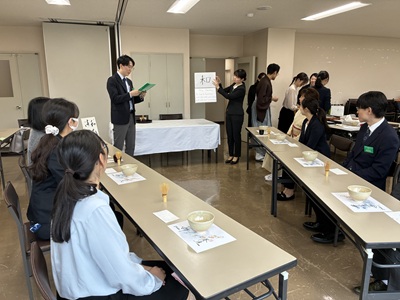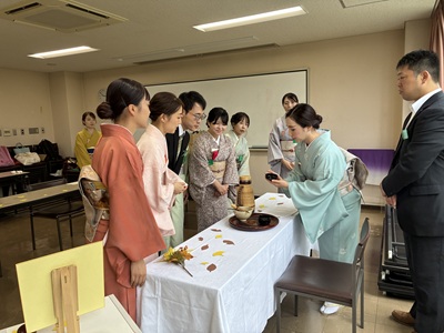 次に、「茶の湯の経験のない人に茶の湯を伝える」と題して、グループ毎に他の出向員をお客に迎えて呈茶を行いました。各班、限られた道具を用いてお茶を点てると共に、茶の湯未経験の方をお迎えする想定でお茶の点て方やいただき方について説明するなど、お茶の楽しさを伝えようと工夫を凝らしていました。