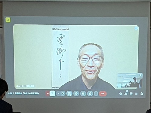 2日目は、「海外での茶道活動」と題して今日庵業躰の鈴木宗慶 ニューヨーク出張所責任講師兼北米総局専任講師がオンラインで事例紹介。ニューヨーク出張所の茶室や現地での稽古などについて、写真を用いて説明され、現地の方の茶道に対する想いなども話されました。