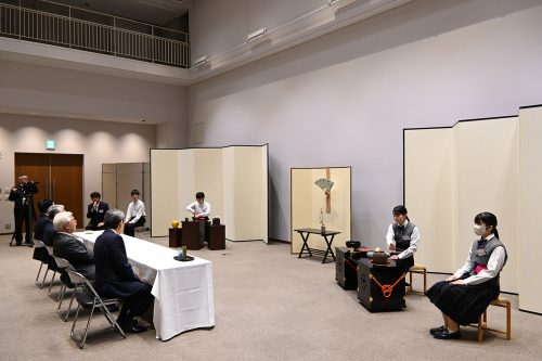 学校茶道の参加校は、久留米市立三潴中学校、久留米信愛中学校、福岡県立明善高等学校、福岡県立小郡高等学校、福岡県立福島高等学校、久留米学園高等学校、久留米信愛高等学校、久留米工業高等専門学校、 久留米大学医学部、福岡県立久留米聴覚特別支援学校の皆さん。