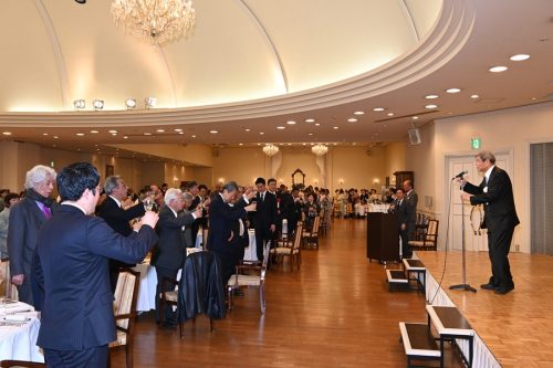 久留米支部 井手和英副支部長の主催者挨拶、そして、伊住宗禮様、次期交流会主管の奄美大島支所 有村修一支所長による挨拶と続き、村岡安廣副地区長(淡交会参事・佐賀支部支部長)の発声で乾杯。