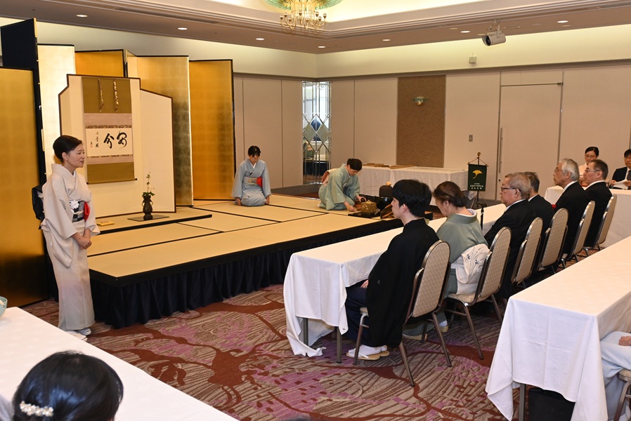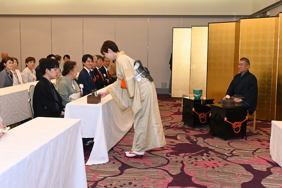 献茶式に際して、都ホテル尼崎「すみれの間」に櫻栄会・淡交会阪神支部(樽谷清孝支部長)担当の濃茶席、「さつきの間」に同青年部・学校茶道連絡協議会担当の薄茶席が設けられ、参列者に一碗が呈されました。