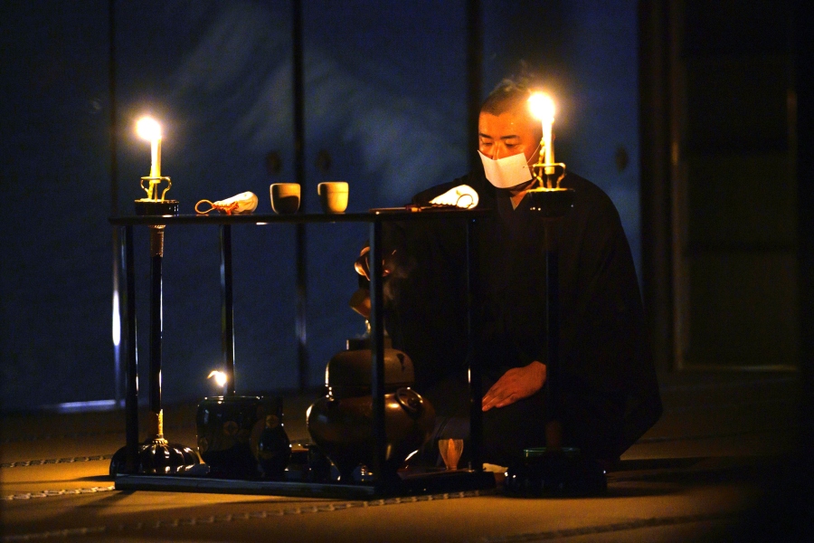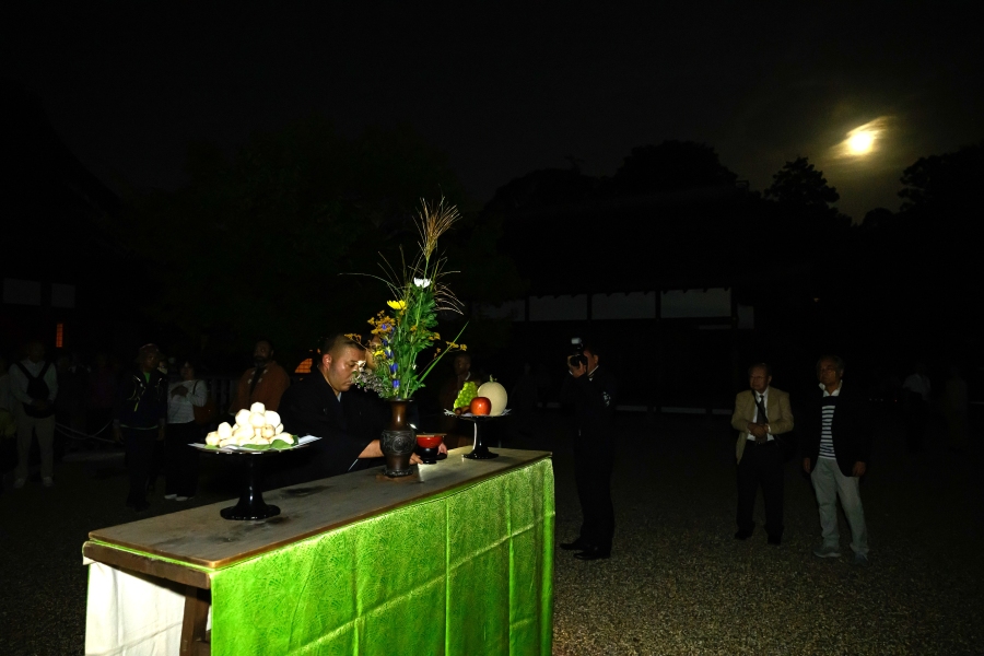 午後6時、伊住様は、鑑真和上坐像が奉安されている御影堂に進み、点前座に着座。濃茶と薄茶を謹点し、鑑真和上と名月に捧げられました。