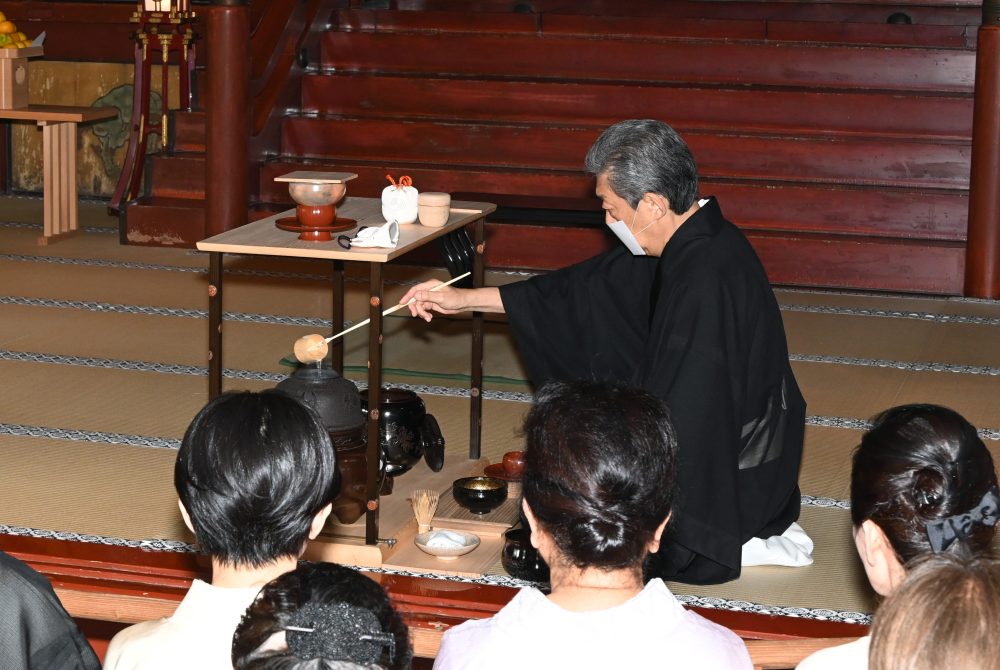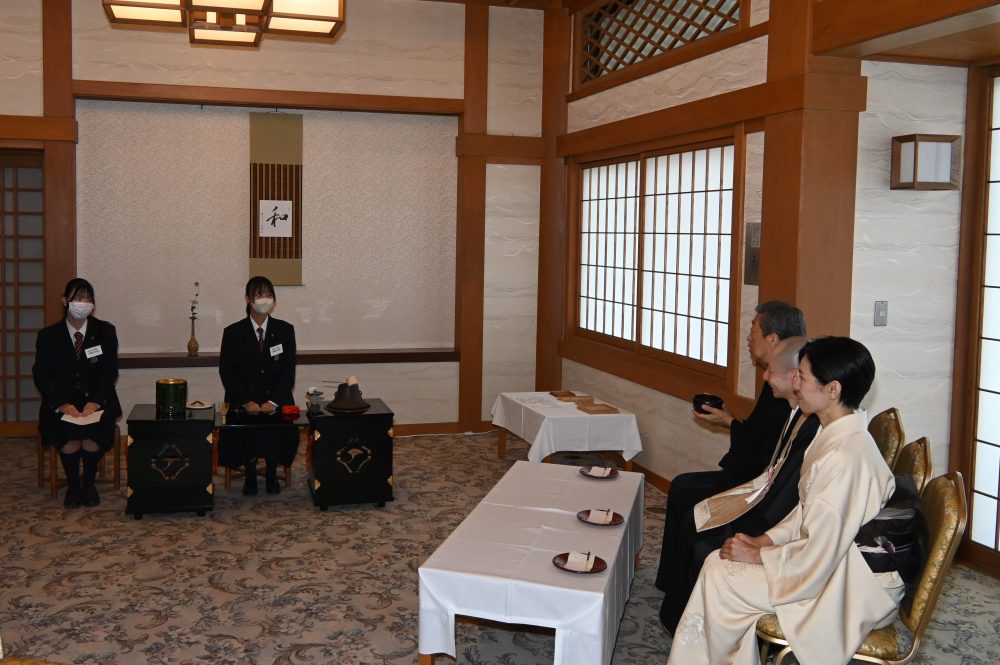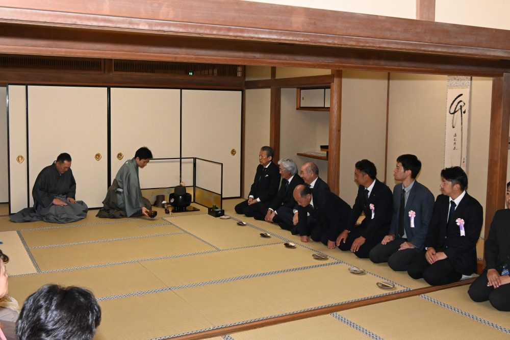 献茶式に際して、洒心亭に淡交会鎌倉支部(上野 孝支部長)の青木宗良氏(元監事)担当の副席、常陸席に髙間宗恭氏(同支部副幹事長)担当の副席、直会殿に鎌倉学校茶道連絡協議会担当の立礼席が設けられ、参列者に一碗が呈されました。