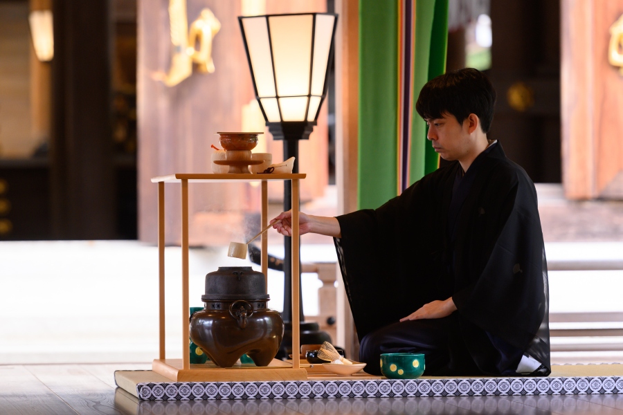 午前10時、若宗匠は神楽殿に入り、点前座に着座。濃茶と薄茶を謹点し、ご祭神に捧げられました。