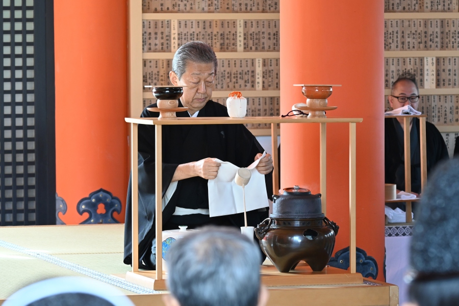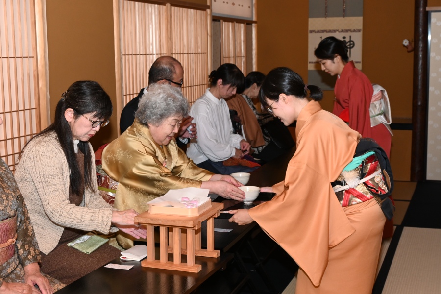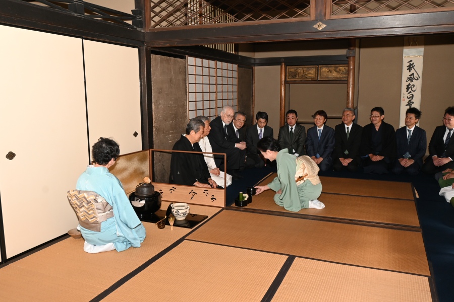 献茶式に際して、「寶主軒」に今日庵担当の拝服席、「松の下屋」に淡交会京都北支部(富田謙三名誉支部長、鮒子田昭司支部長)担当の本席、社務所「正庁の間」に京都西支部(片岡宏二支部長)担当の副席が設けられ、参列者に一碗が呈されました。